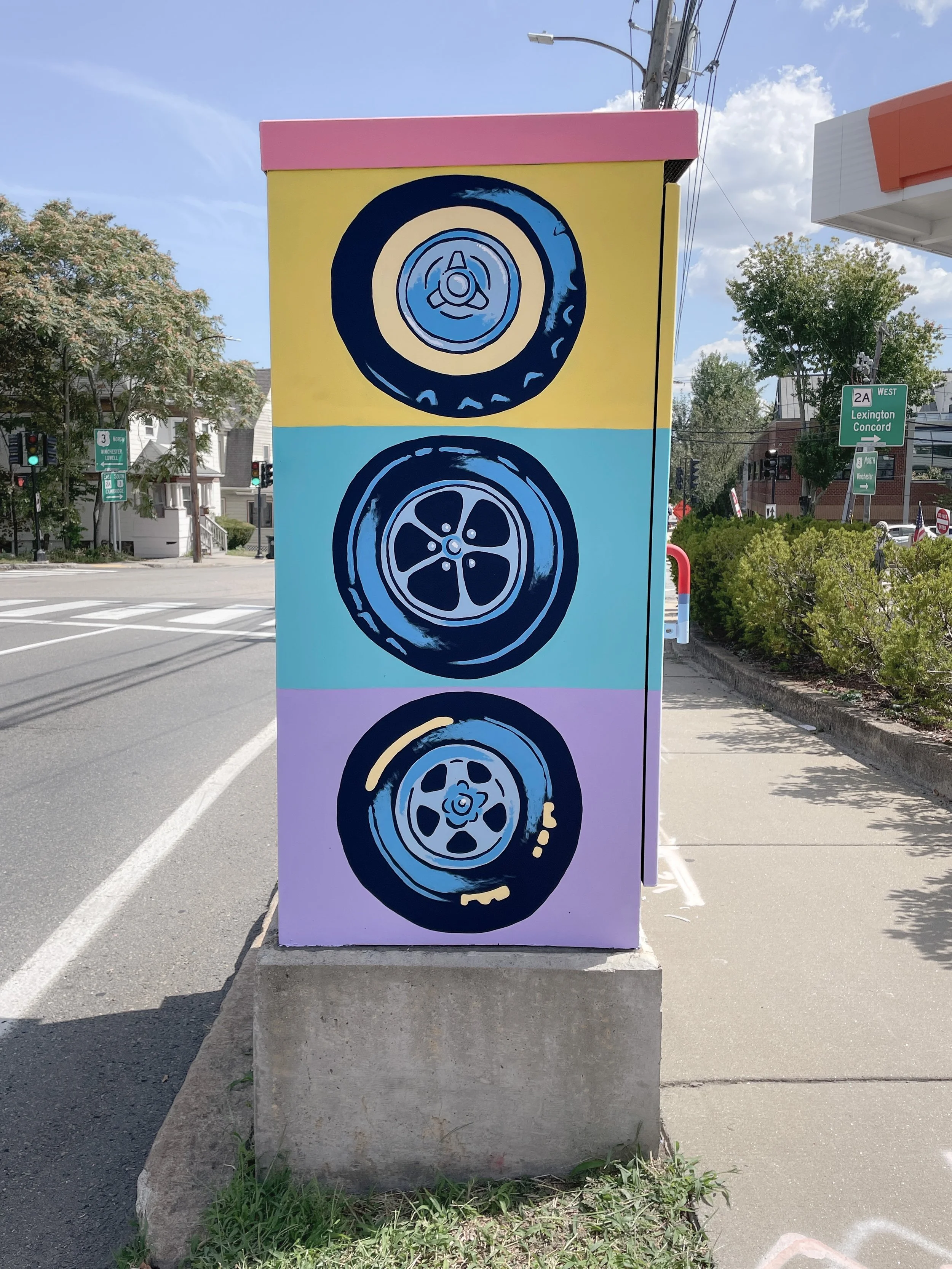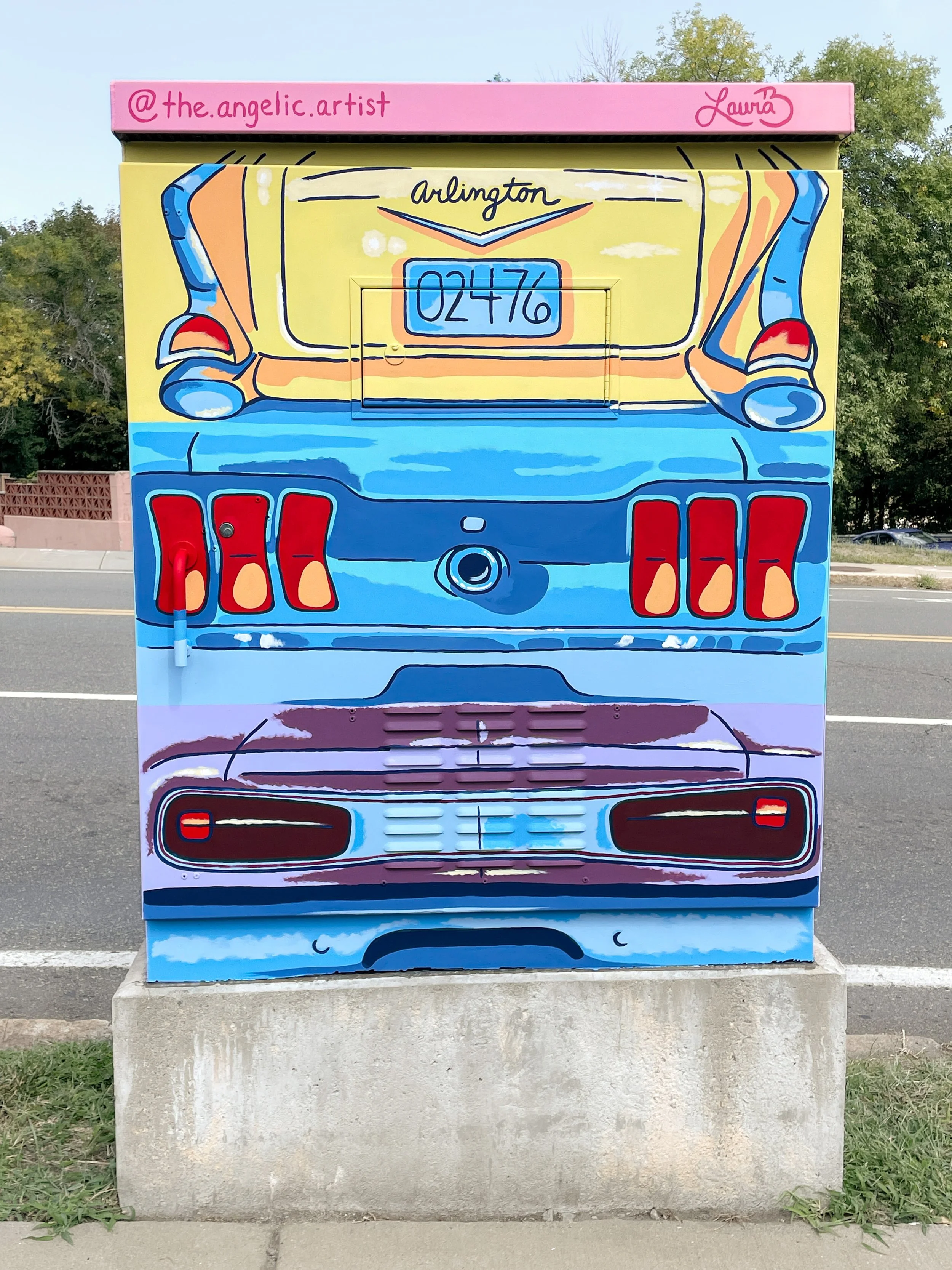 Designed and hand-painted a utility box in Arlington, MA with a retro inspired color palette and vintage cars to freshen up the corner alongside the local Gulf gas station.